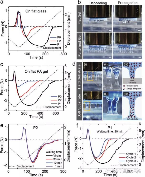 受喉盤魚的吸盤結(jié)構(gòu)(a)的啟發(fā),作者在水凝膠表面設(shè)計(jì)了由凹槽分隔的六邊形結(jié)構(gòu)(b)。凹槽起到排水通道的作用,以促進(jìn)六邊形表面在水下與基體的快速接觸(c)。凝膠的六邊形界面上的動(dòng)態(tài)鍵與基質(zhì)結(jié)合以粘附界面。在拉伸過程中,凝膠本體動(dòng)態(tài)鍵的斷裂耗散能量,延緩了界面處的脫粘(d-e)。另外,獨(dú)立的六邊形界面防止裂紋在整個(gè)界面的連續(xù)擴(kuò)展,也增強(qiáng)了粘附強(qiáng)度和剝離能(f)。