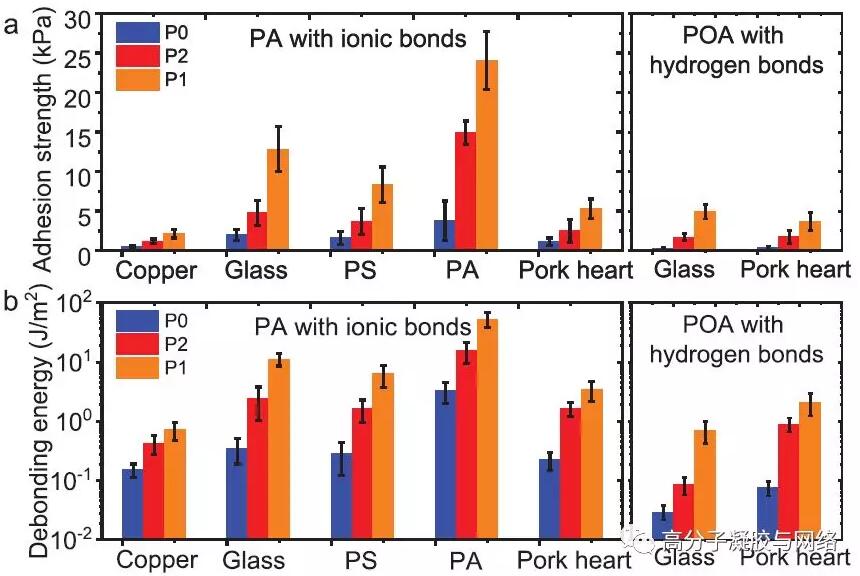 從粘附強(qiáng)度(a)和剝離能(b)的柱狀圖可看出,凝膠對(duì)不同的基質(zhì)表面都表現(xiàn)出粘附能力,P1凝膠的粘附強(qiáng)度和剝離能最高分別為25 kPa和50 J/m2。同時(shí),采用氫鍵做可逆鍵的POA凝膠在玻璃和生物組織表面也表現(xiàn)出較好的粘附。