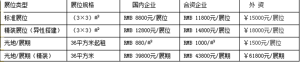 ※注:標(biāo)準(zhǔn)展位:三面圍板(2.5m高)、地毯、楣板、射燈二支、洽談桌一張、椅子二把220V插座一個(gè)。